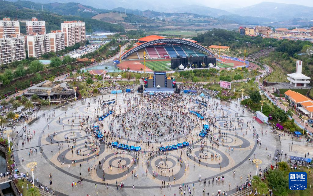 这是4月15日拍摄的云南省临沧市耿马傣族佤族自治县勐相湿地公园广场泼水节现场(无人机照片)。