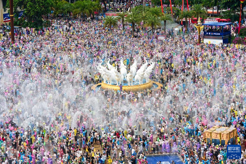 4月15日,人们在云南省西双版纳傣族自治州景洪市泼水广场泼水狂欢。