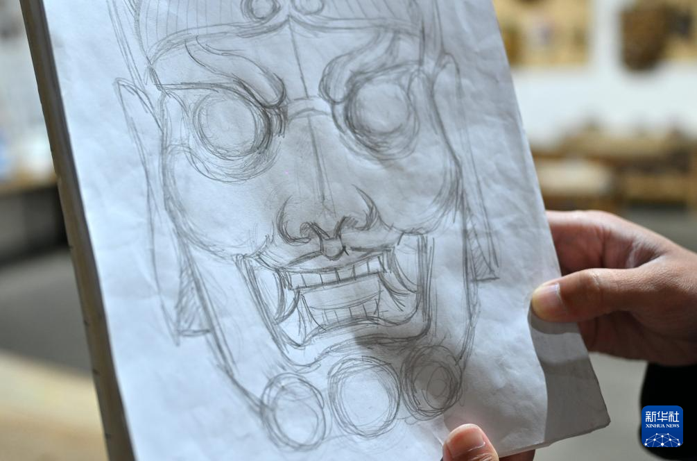 近日,湖北省恩施土家族苗族自治州傩面具制作传承人汪儒斌正忙着手工雕刻、绘制一批傩面具,为即将进行的一场傩文化研学活动作准备。