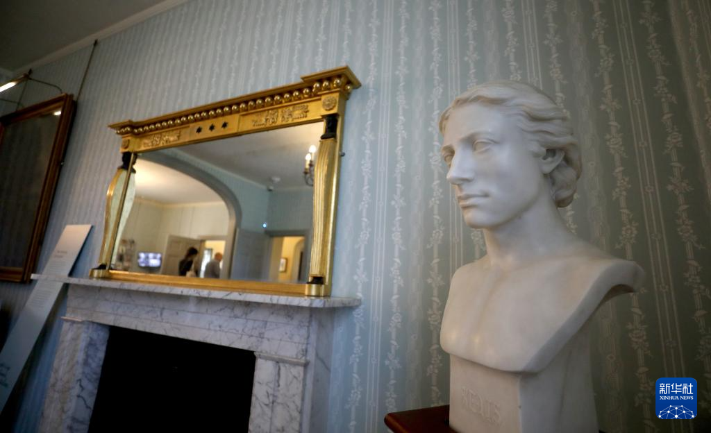 这是4月16日在英国伦敦济慈故居内拍摄的济慈雕像。