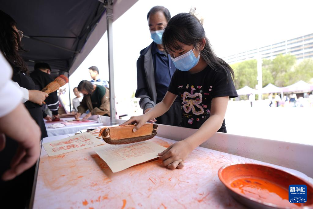4月20日,市民在活动现场体验雕版印刷。