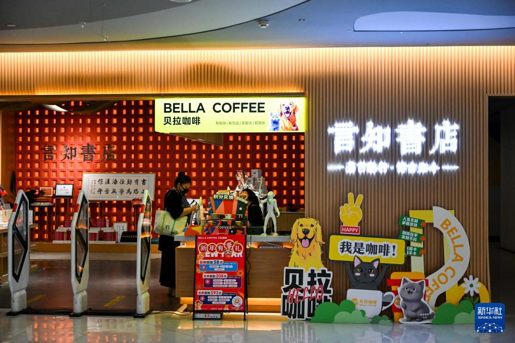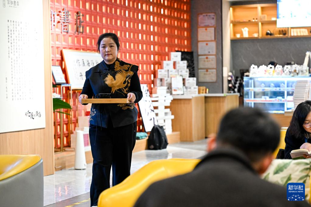 4月21日,在乌兰察布市集宁区言知书店,一位市民在购买饮品。