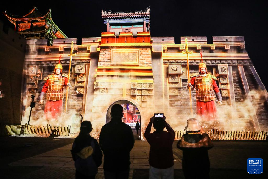 4月26日,游客在嘉峪关关城景区体验夜游灯光剧《天下嘉峪关》。