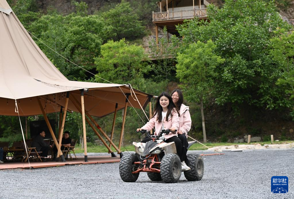 5月7日,游客在赞皇县大凡露营基地体验摩托驾驶。