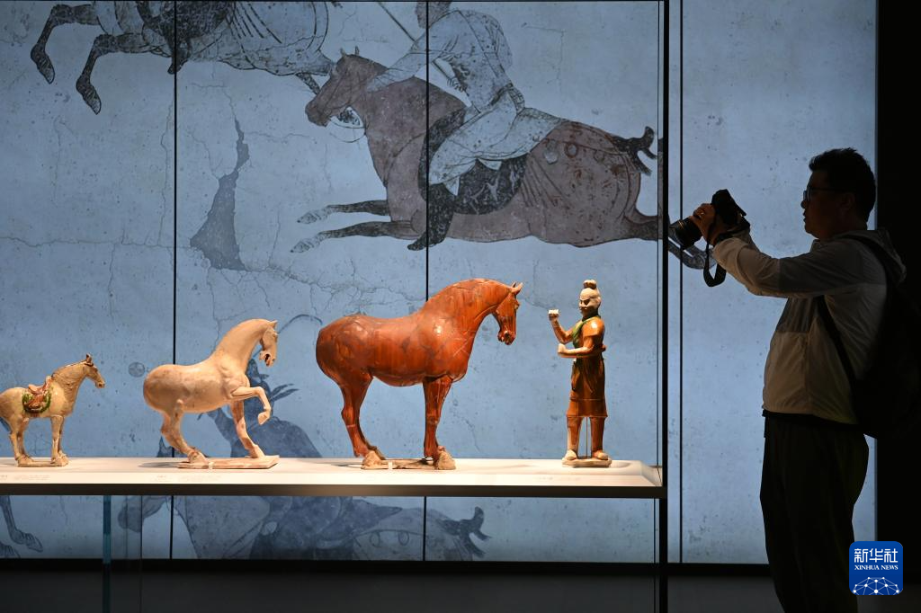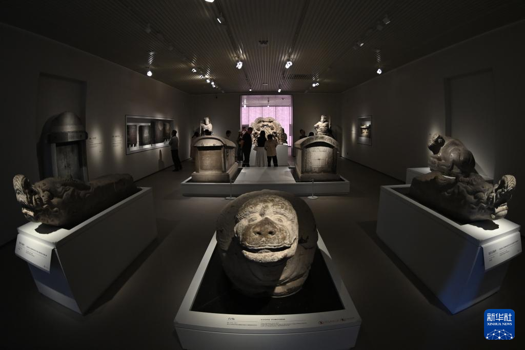 5月12日,游客在改扩建后的西安碑林博物馆北区场馆参观昭陵六骏石雕。