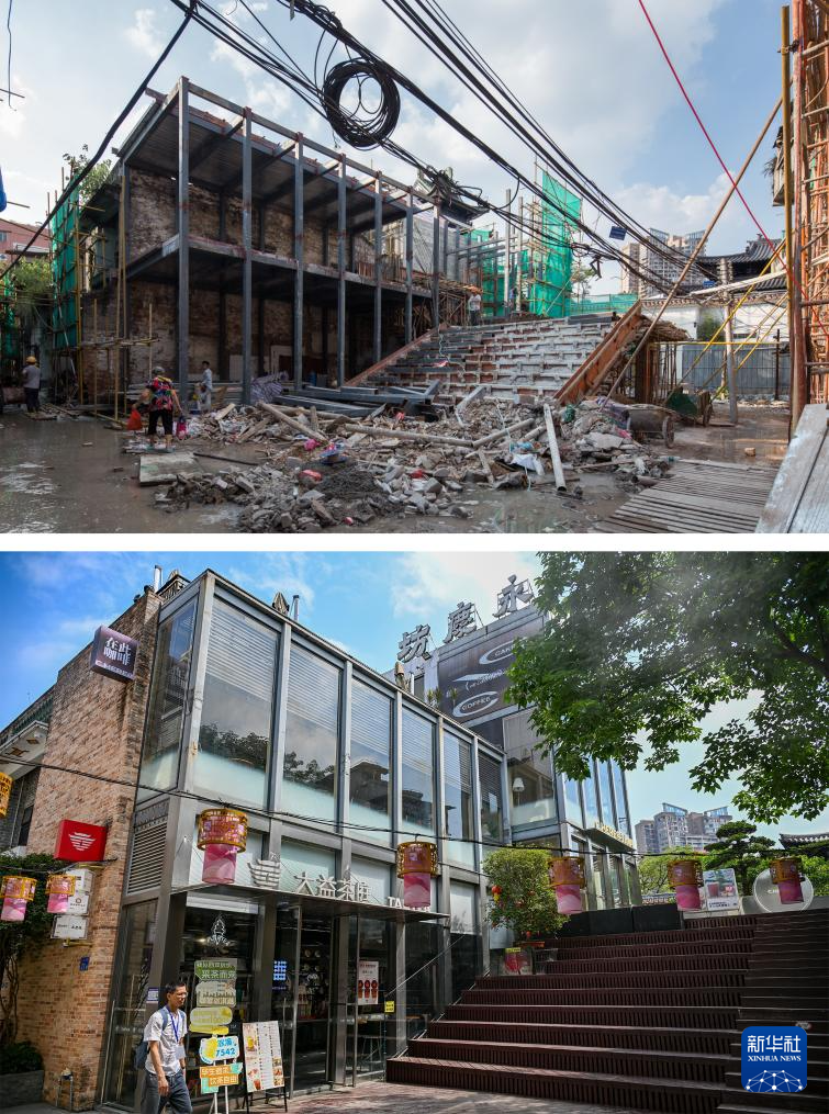 这是一张拼版照片:上图为改造前的乡愁广场(资料照片,新华社发);下图为2025年5月13日拍摄的永庆坊乡愁广场(新华社记者陈朔摄)。