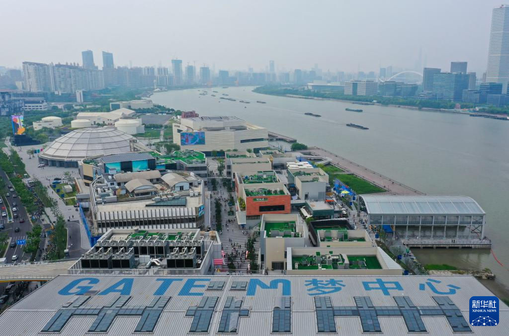坐落在黄浦江畔的西岸梦中心(5月17日摄,无人机照片)。
