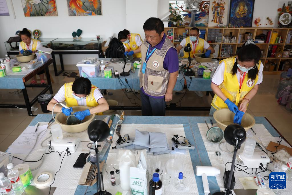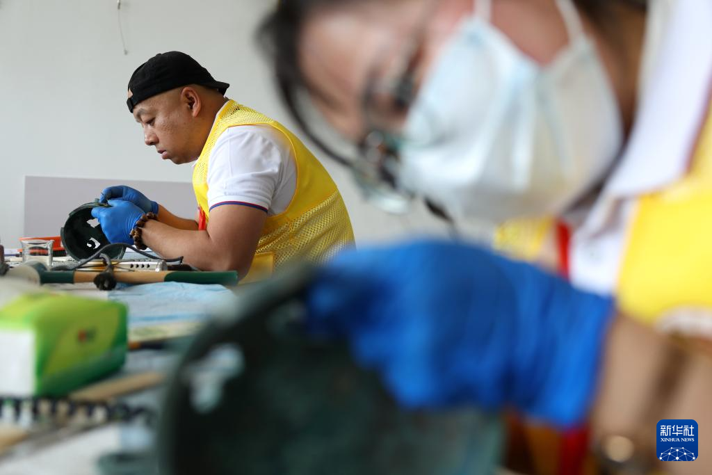 5月22日,来自新疆维吾尔自治区博物馆的参赛选手石亮(左)在金属文物修复比赛中。