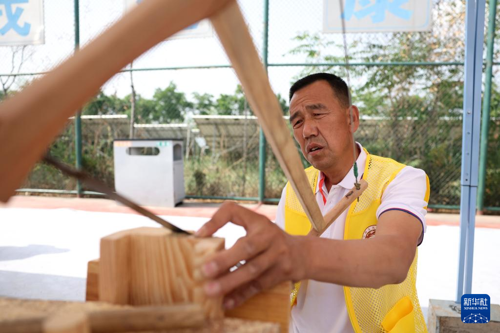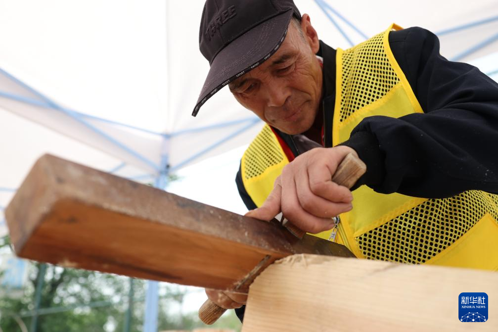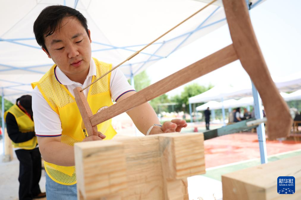 5月22日,来自甘肃昊廷古建工程有限公司的参赛选手杨永仓在木作文物修复比赛中。
