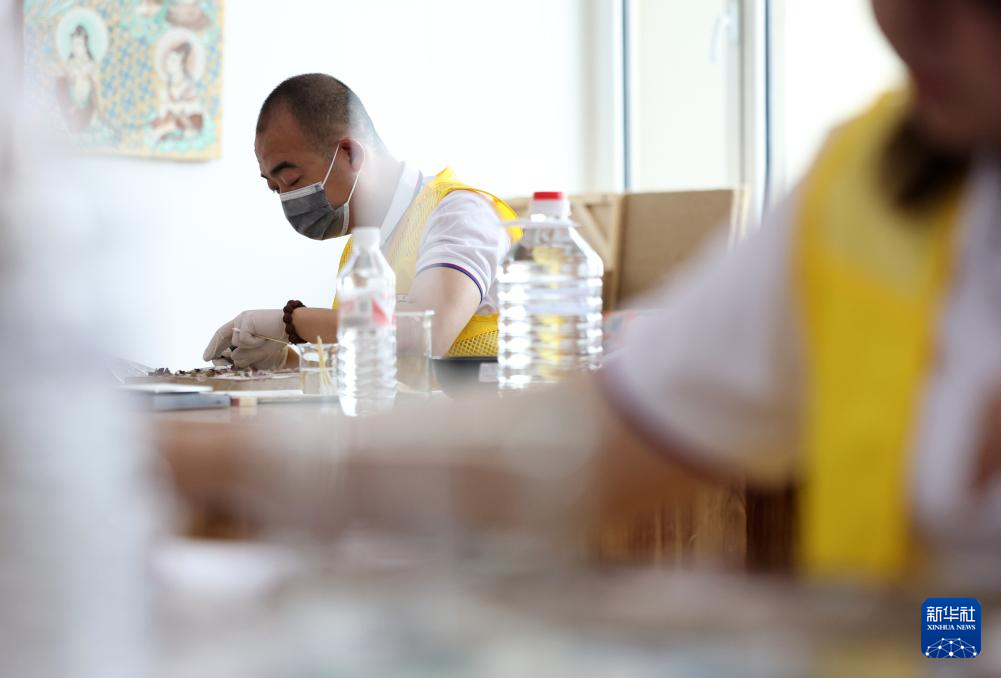 5月22日,来自甘肃永靖白塔工匠技术咨询有限公司的参赛选手王太恒在泥瓦作文物修复比赛中。