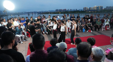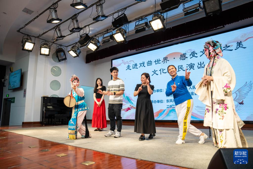 6月4日,在郴州市北湖区人民路街道万花冲社区,湖南省昆剧团青年演员(左一、右一)在带领观众体验昆曲。