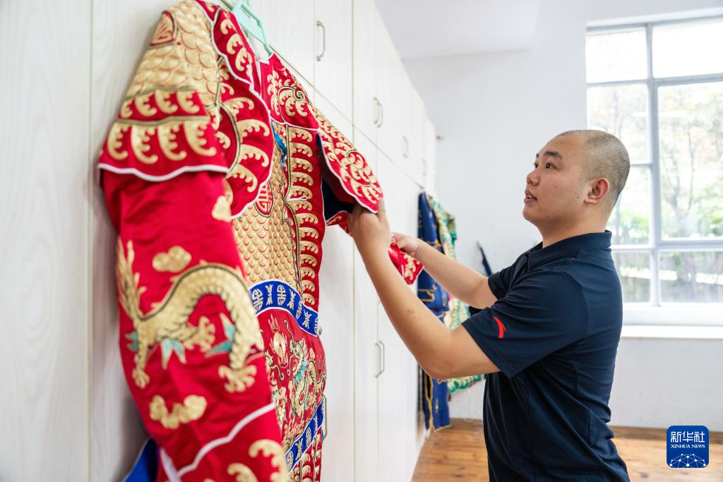 6月4日,在湖南省昆剧团练功房,青年演员蔡俊凯在整理戏服。