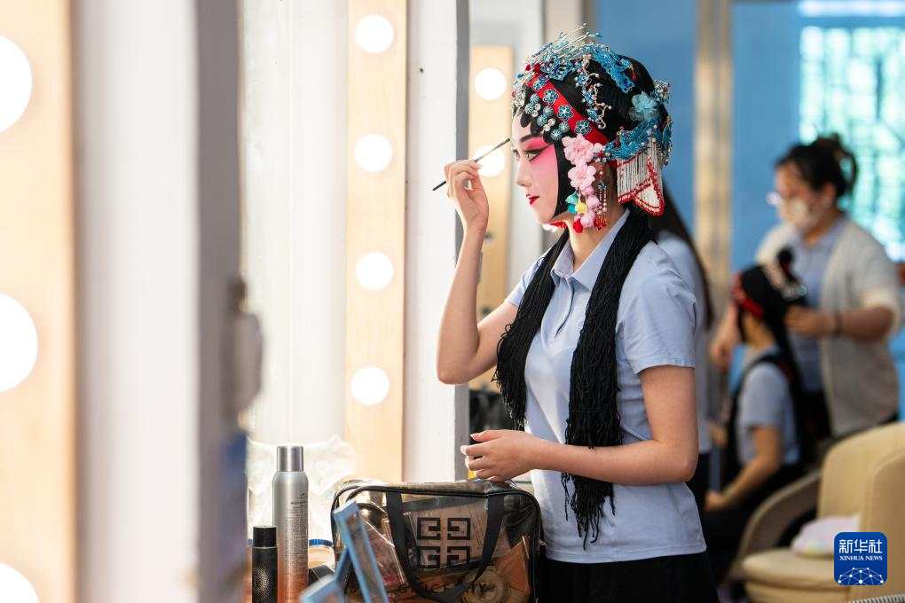 6月3日,在湖南省昆剧团化妆间,一级演员刘捷(右)在演出前化妆。