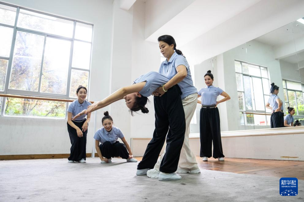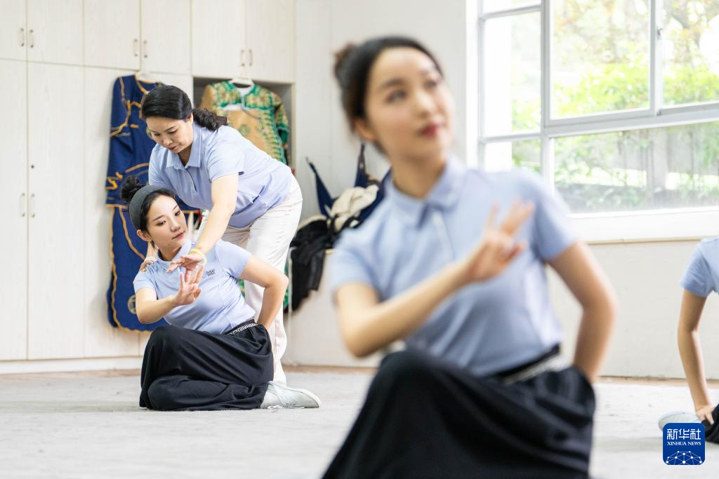 6月4日,在湖南省昆剧团练功房,资深演员王荔梅(前右)在帮助青年演员练习基本功。