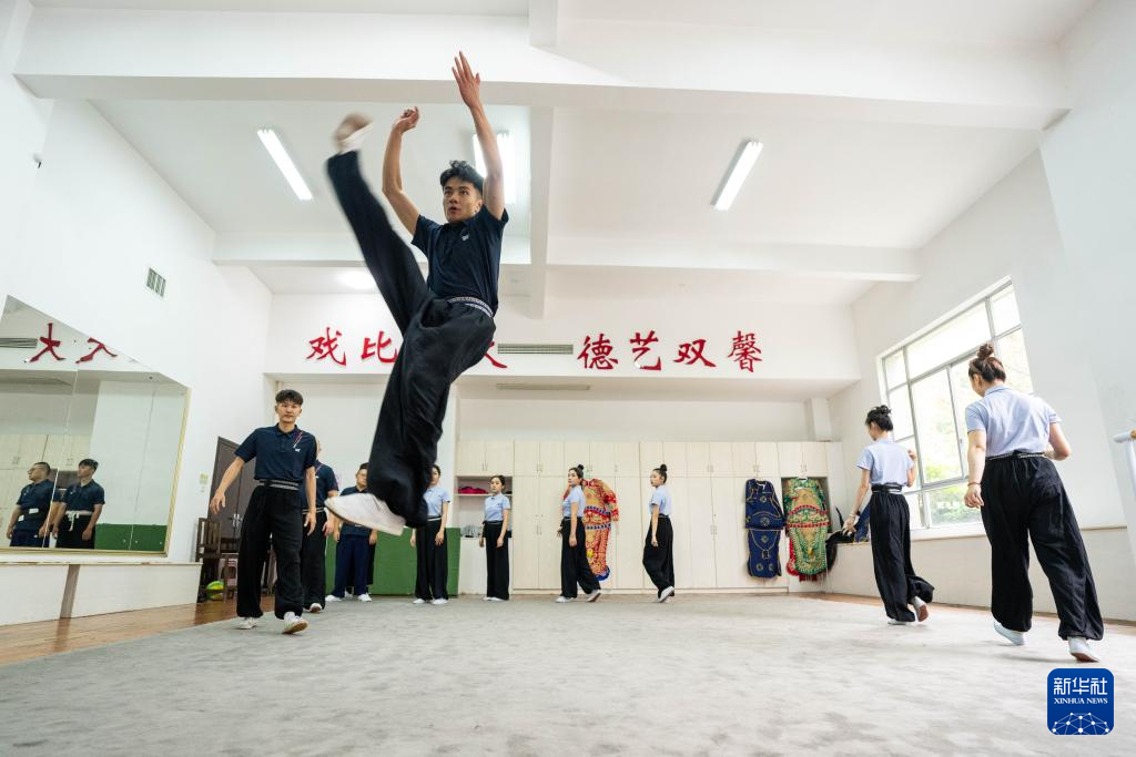 6月4日,在湖南省昆剧团练功房,青年演员廖茂鑫(前)在练习基本功。