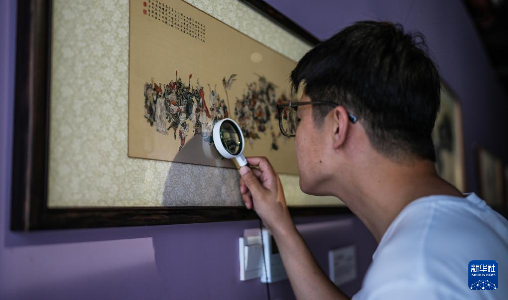 6月6日,在东台西溪天仙缘景区内的东台发绣展示馆,游客用放大镜观赏发绣作品《一百零八将》。