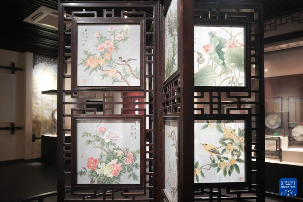 6月6日在东台市博物馆拍摄的以花鸟为题材的发绣作品。