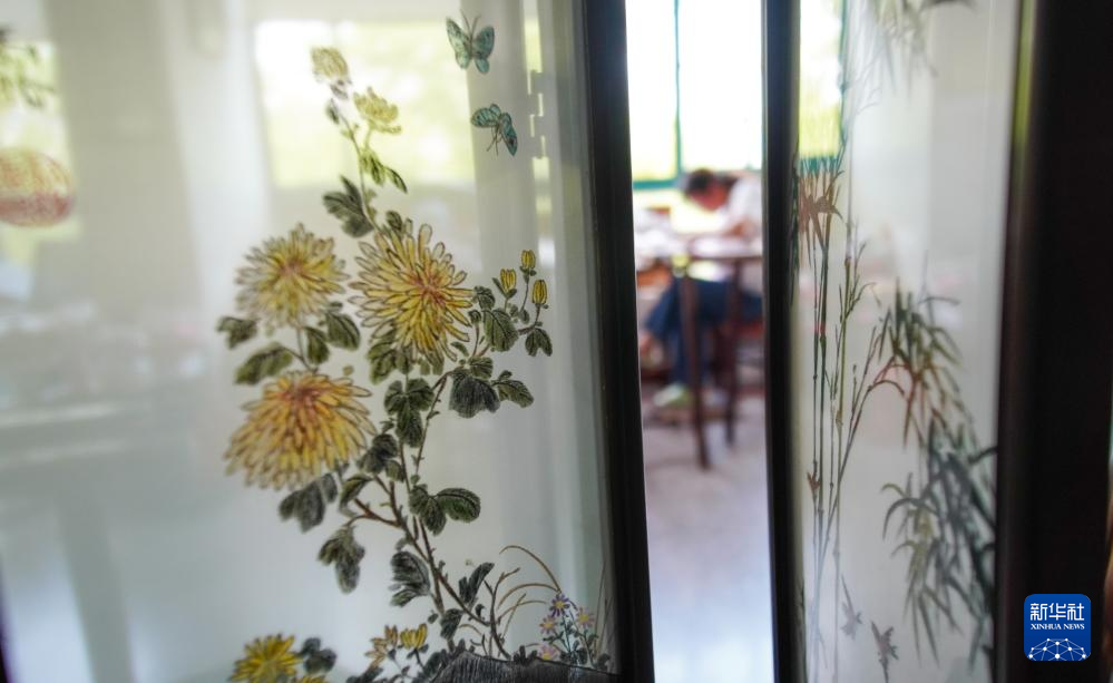 6月6日,在东台嘉丽发绣厂,东台发绣传承人陈伯余指导徒弟装裱一幅双面发绣作品。