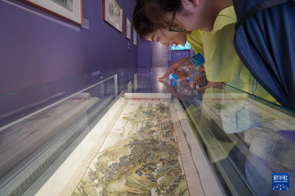 6月6日,在东台西溪天仙缘景区内的东台发绣展示馆,游客观赏发绣长卷《姑苏繁华图》。