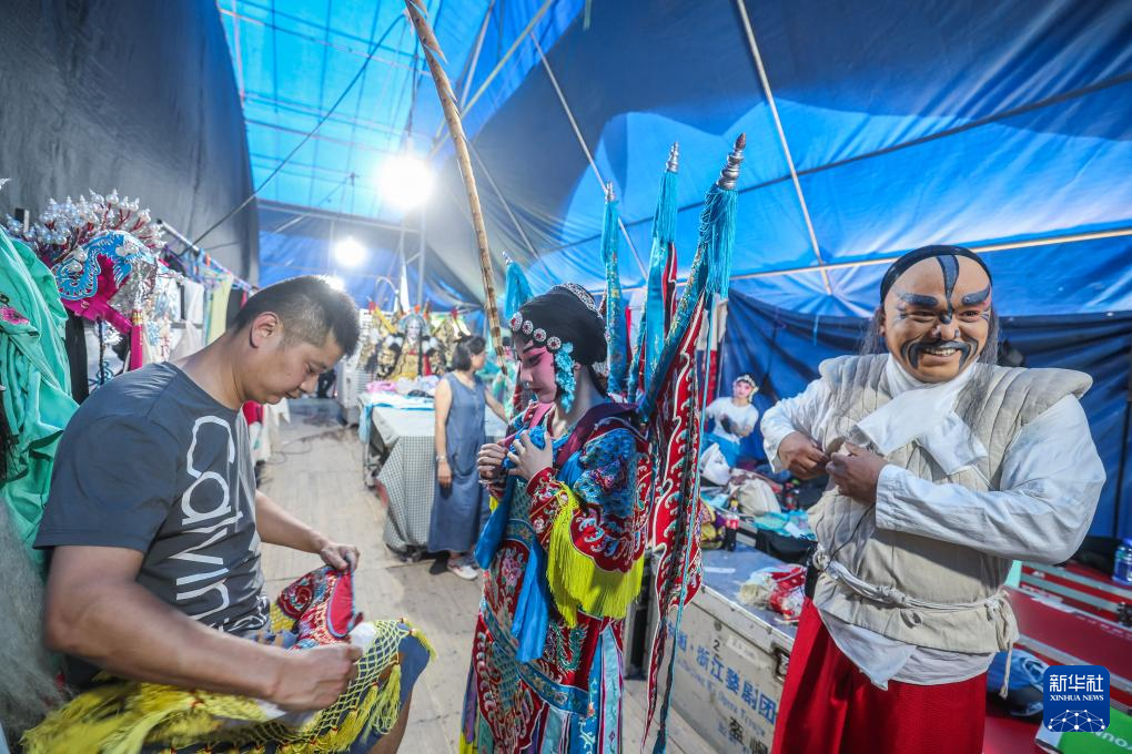 6月17日,演员们在武义后陈村的演出后台准备上场。