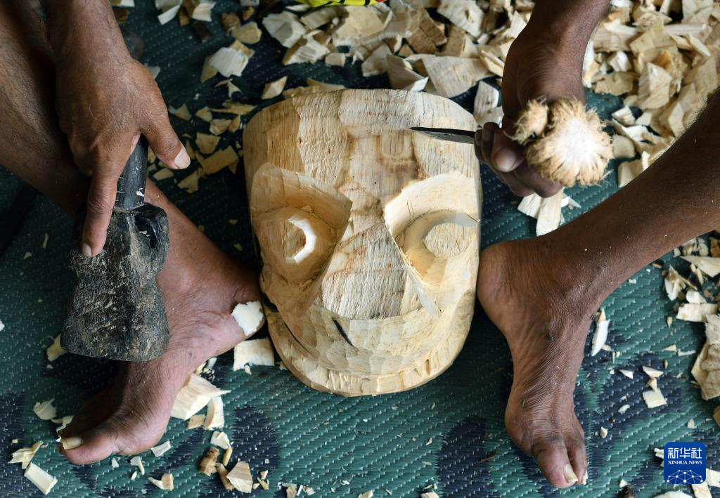 6月25日,一名手工艺者在斯里兰卡戈纳波拉村制作斯里兰卡传统面具。