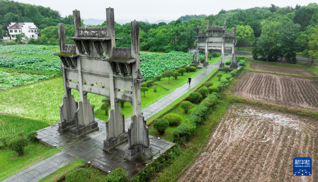 6月19日,周虎在位于歙县的全国重点文物保护单位棠樾牌坊群巡查(无人机照片)。