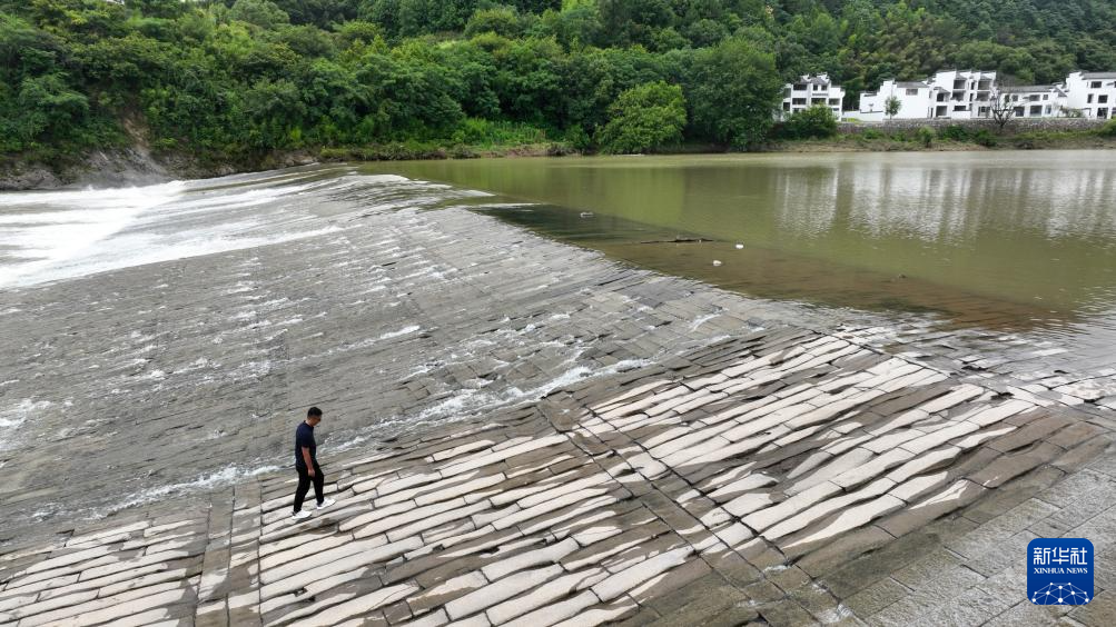 6月20日,周虎在位于歙县的全国重点文物保护单位渔梁坝巡查(无人机照片)。