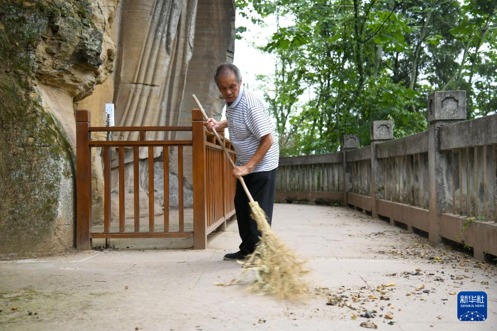 曾祥余在清扫石窟前的落叶(6月14日摄)。