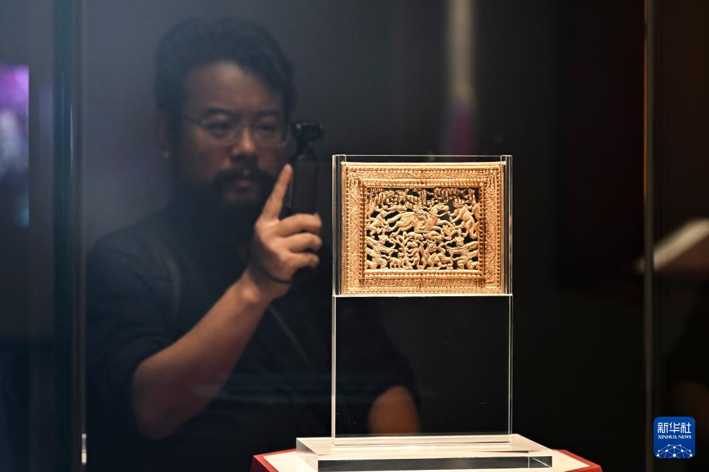 7月8日,媒体人员在“宁夏固原文物精品展”上拍摄展品狩猎图金方奇。