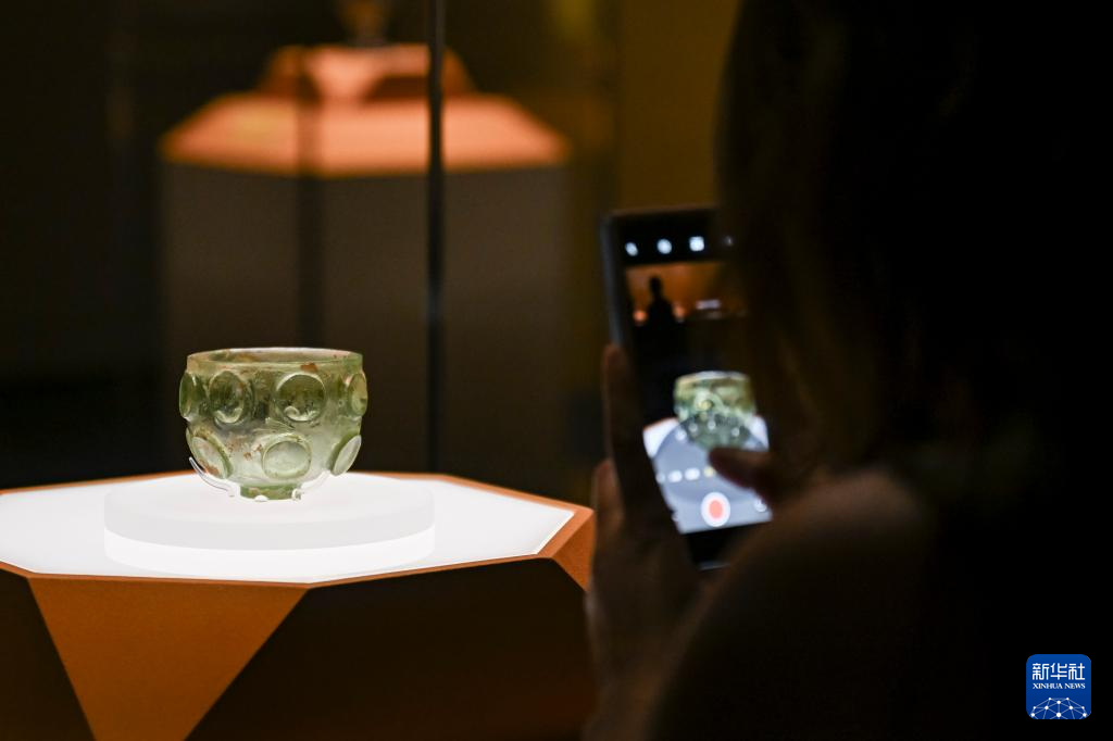 7月8日,媒体人员在“宁夏固原文物精品展”上拍摄展品凸钉玻璃碗。