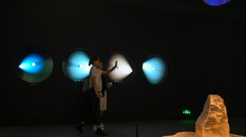 7月7日,游客参观江西南昌滕王阁内的历代滕王阁建筑景观全息数字复原展示。