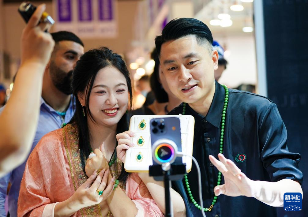 7月10日,两名主播在昆明石博会上直播售卖玉石。