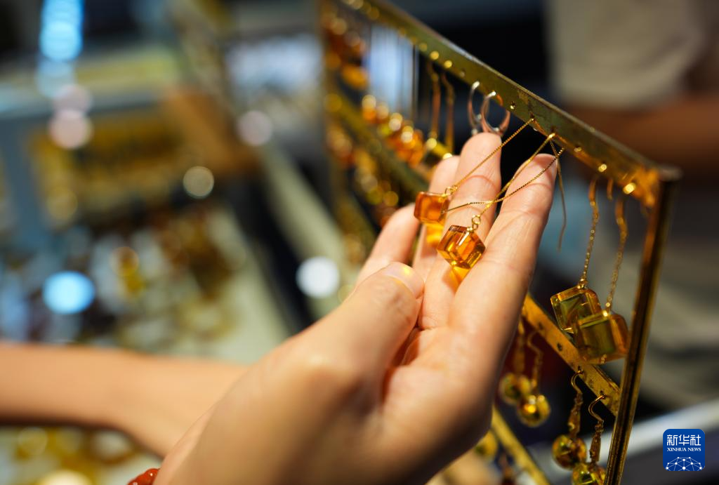 这是7月10日在昆明石博会上拍摄的琥珀饰品。