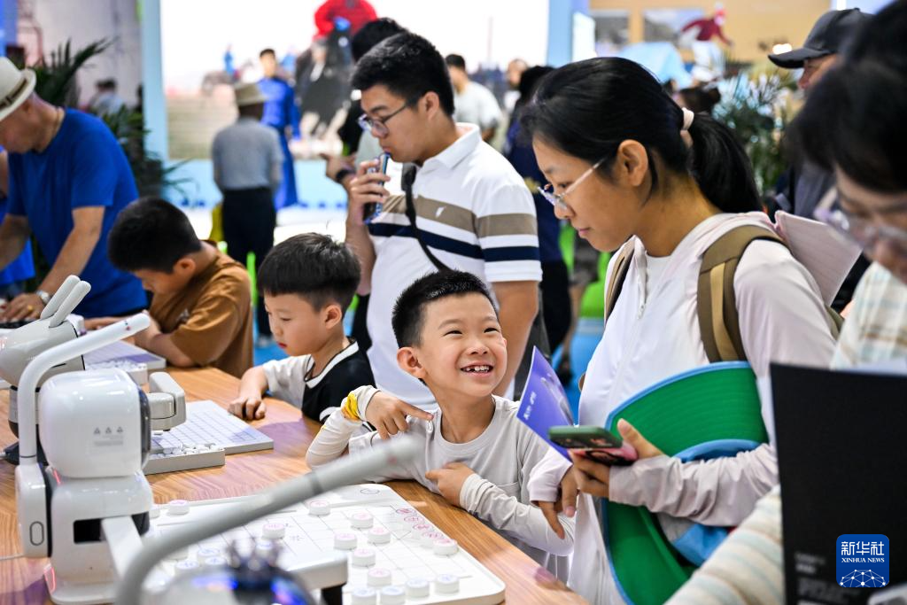 7月17日,观众在第九届内蒙古自治区文化产业博览交易会现场与机器人互动。