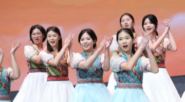 7月18日,在意大利博洛尼亚,绣球花小合唱团与安东尼亚诺小合唱团的团员们一起向观众致意。
