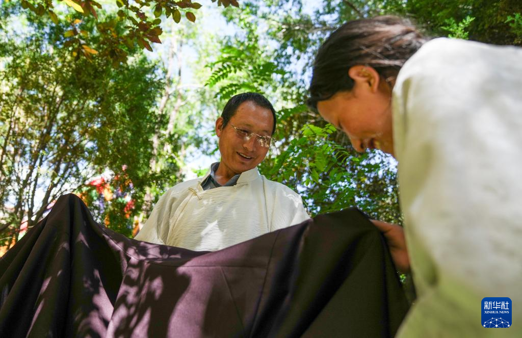 洛桑麦朗在检查做好的藏装(8月15日摄)。