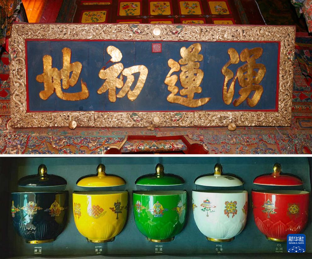 拼版照片:上图为悬挂于布达拉宫西大殿正中上方、乾隆赐予八世达赖喇嘛的御笔金字匾额“涌莲初地”;下图为布达拉宫红山脚下文创体验店内的“莲花五蕴杯”文创瓷器(2021年1月26日摄)。新华社记者 孙非 摄