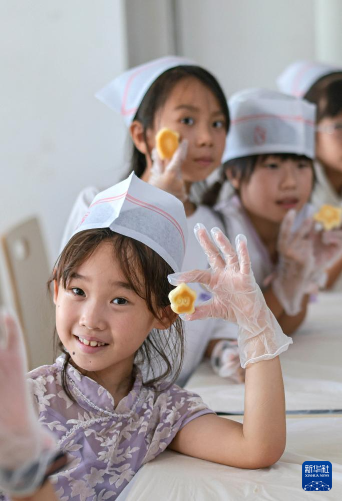 8月26日,在山东省青岛市城阳区河套街道西河套社区,小朋友学做七夕巧果。