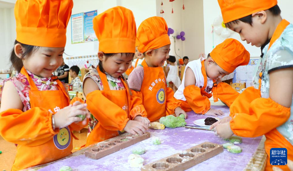 8月26日,在华能山东石岛湾核电有限公司生活区食堂,暑期托管班的孩子制作传统七夕美食巧花。