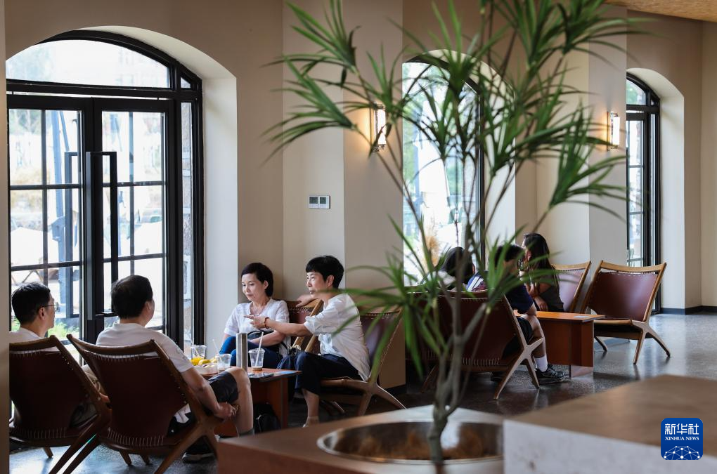 9月19日,游客在沈荡镇谷仓文化产业园的咖啡馆内休憩。谷仓文化产业园由之前的国营粮仓改建而成,也是当地的网红打卡点之一。