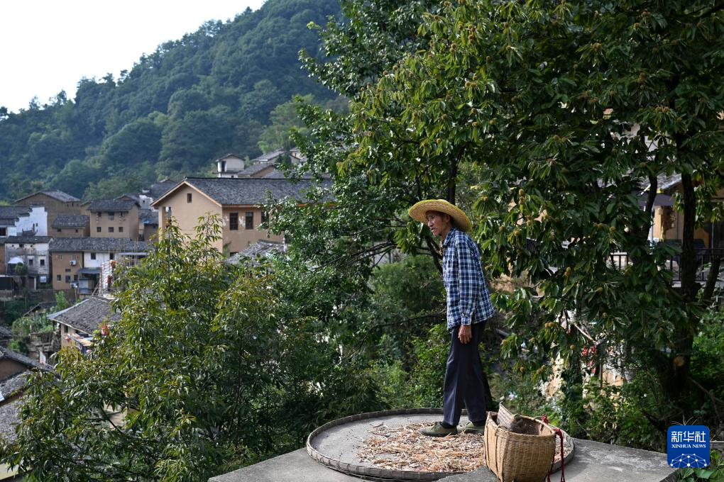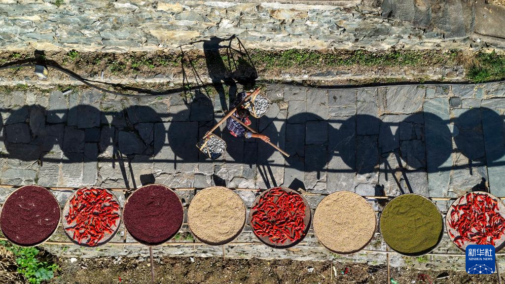 时值秋收时节,村民们利用晴好天气,将辣椒、玉米、山核桃等农作物晾晒在房前屋后,形成独具特色的“晒秋”景观。
