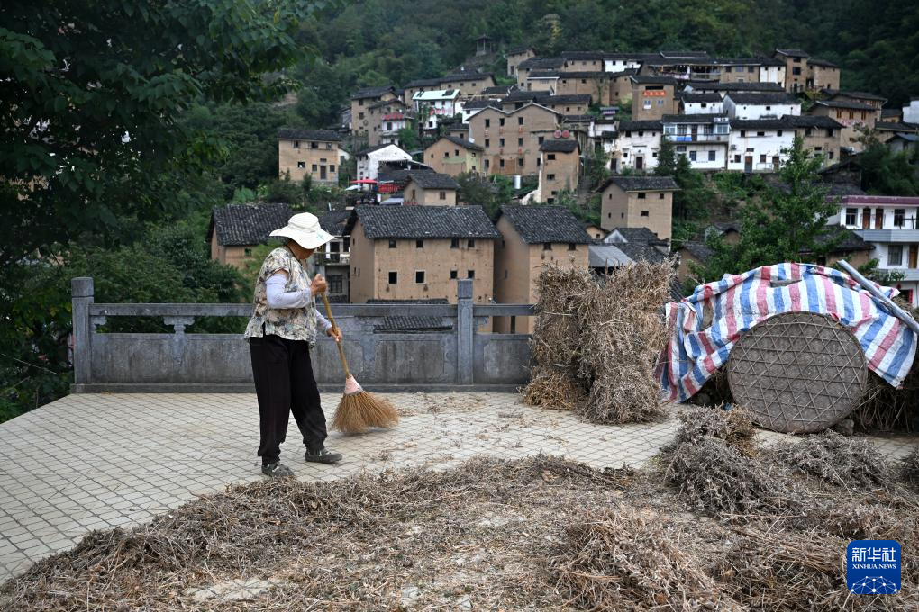 9月17日,阳产村村民在土楼前晾晒农作物。