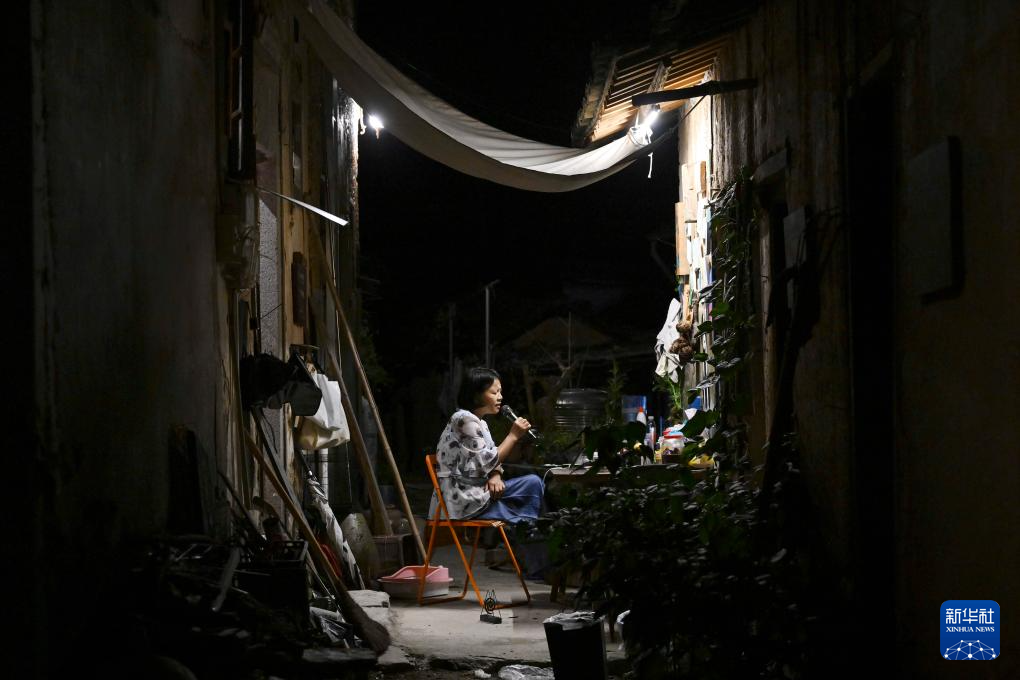 9月18日,阳产村村民吃完晚饭后对着手机唱歌休息。