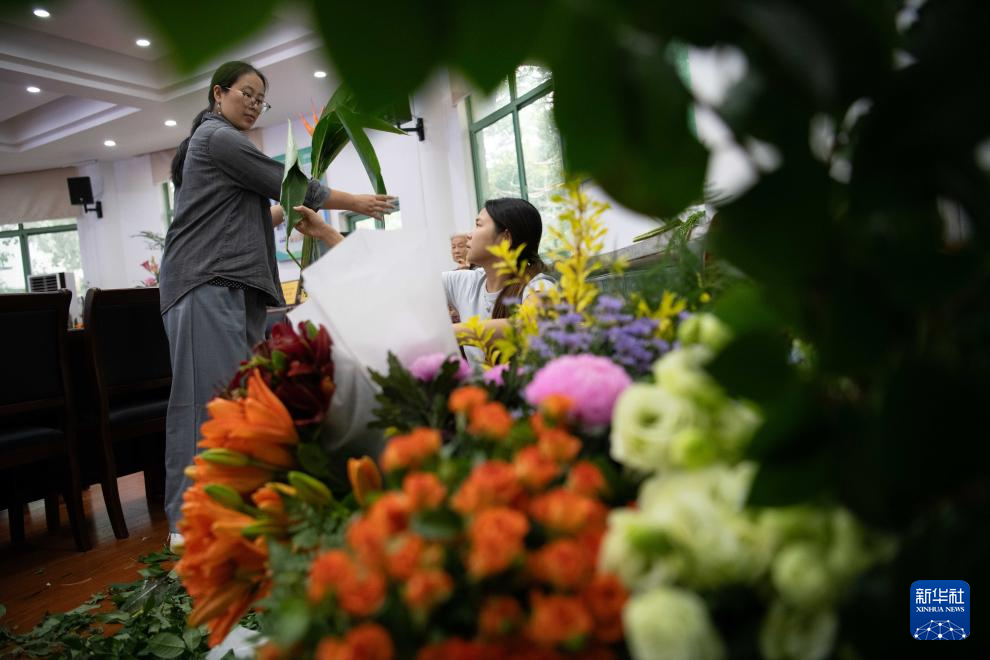10月10日,在位于安徽合肥的一家花店,付玉兰挑选用于插花创作的花材。