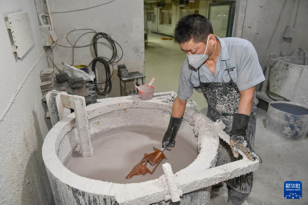 10月29日,安徽铜陵一家铜器制作企业的铜艺工人在把蜡模沾浆制壳。