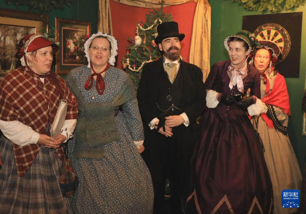 11月22日,在美国旧金山,人们身着维多利亚时期风格的服饰在狄更斯圣诞博览会上表演。