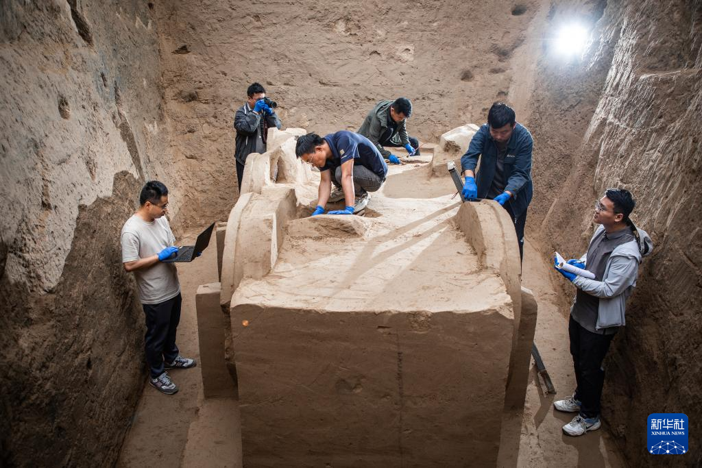 陕西省考古研究院寨沟遗址考古队队员于有光(右)、秦高敏在陕西清涧瓦窑沟墓地M4号墓葬测量马车数据(2025年9月11日摄)。