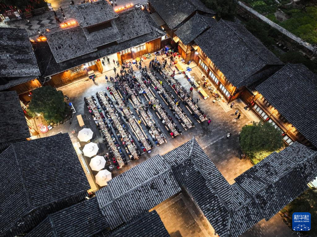 在贵州省黎平县肇兴侗寨,侗族同胞与来宾在侗年活动中共享长桌宴(12月20日摄,无人机照片)。
