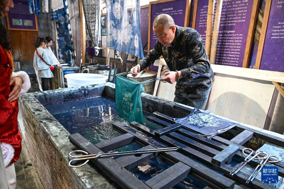 在贵州省黎平县肇兴侗寨侗品源传统工艺农民专业合作社,游客在体验蜡染技艺(12月19日摄)。