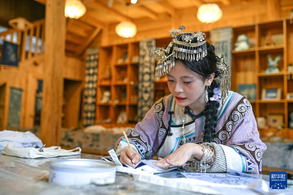 游客在贵州省黎平县肇兴侗寨侗品源传统工艺农民专业合作社里体验蜡染技艺(12月20日摄)。